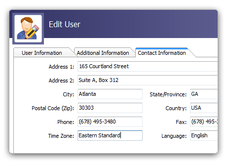Better yet, user profiles can contain as much or as little information as you need. There are the basics — a username and password — plus detailed information, like a phone number, website, e-mail address, time zone, preferred language, and pretty much anything else you might need to know. This information is stored securely on your computer and makes keeping track of your user base a whole lot easier.